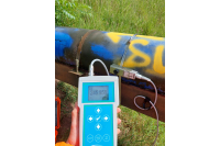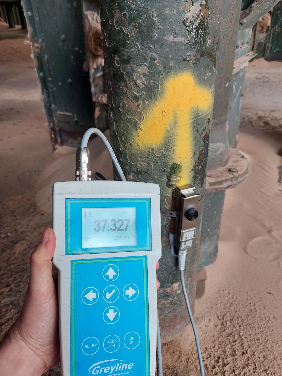 The unit provided stable, accurate results on all the pipes. For four of the pipes, the equipment worked immediately, however on two of the pipes there was an additional step required before measurements could be taken. A fairly thick layer of rust and paint had to be removed from these two pipes with a grinder to expose the pipe metal so that the ultrasound could penetrate the pipe.