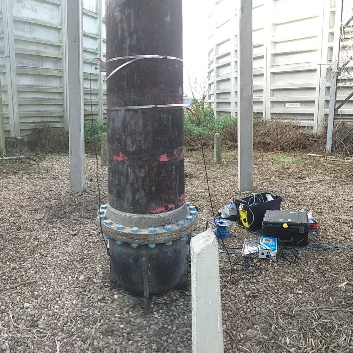 First up was a 600 mm diameter concrete-lined pipe on pre-filtrated effluent, this time Rhys Griffiths our Product and Technical Support Manager was holding the reigns. Rhys decided that he would use Tommy’s SE16C-sensors with a one crossing, measuring the time it takes for the ultrasonic signal transmitted from one transducer to cross the pipe and be received by a second transducer.