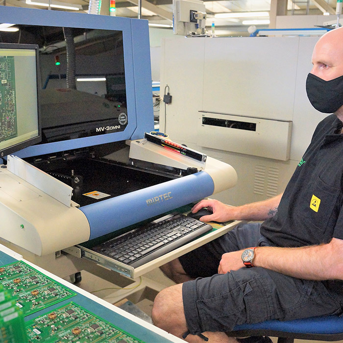 Once the components are placed, the board is passed through a reflow soldering machine. This consists of a controlled heating environment within the machine, which melts the solder paste causing it to solidify so that solder joints are formed. Our specially trained technicians monitor the temperature to ensure the board is not damaged or poorly soldered. The final step is the inspection stage — we use AOI technology to ensure the boards we produce are inspected to the highest standard.